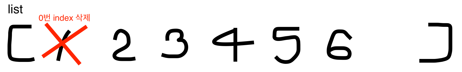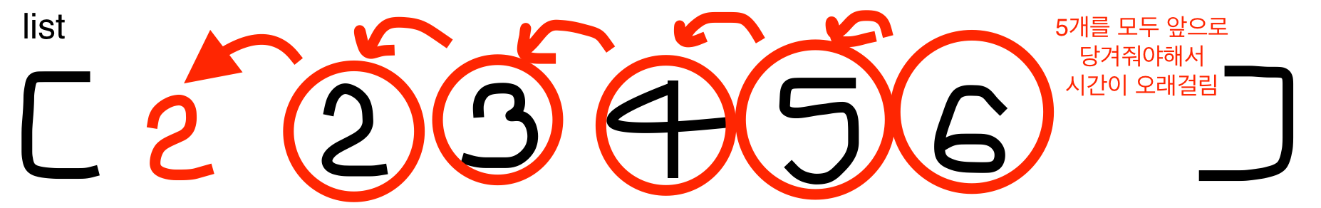 만약 1000000개의 list 에서 맨 앞의 0번째 index 를 삭제한다고 하면 ??? 아주 복잡한 연산이 될 것이다 !