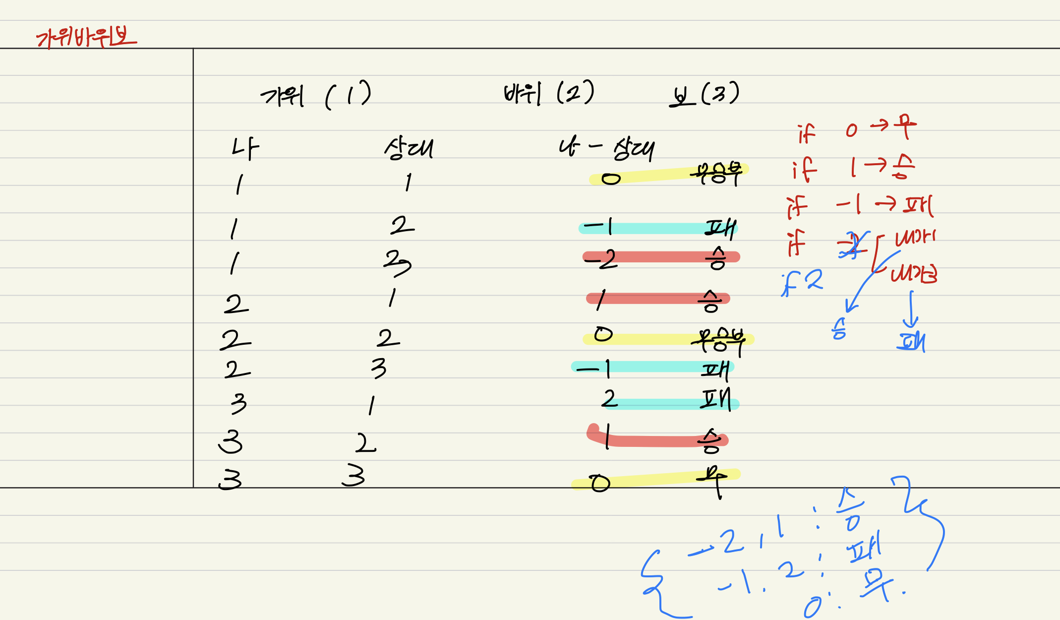 가위 : 1 바위 : 2 보 : 3 라고 생각하고