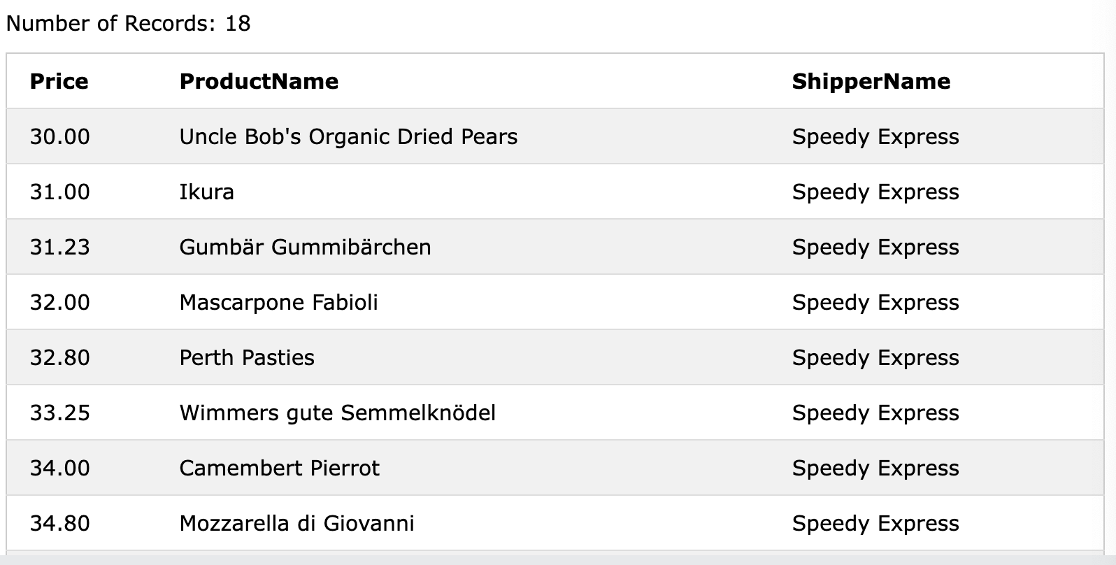 문제 : 배송업체의 이름이 "Speedy Express" 이면서 가격이 30-50 사이인 상품을 조회하세요 !