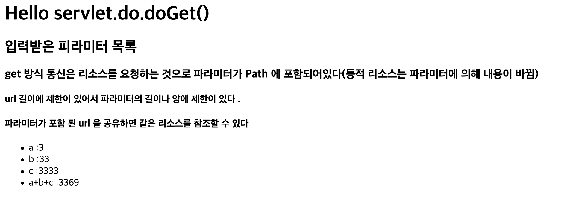 .append("<h3> get 방식 통신은 리소스를 요청하는 것으로 파라미터가 Path 에 포함되어있다(동적 리소스는 파라미터에 의해 내용이 바뀜)</h3>")