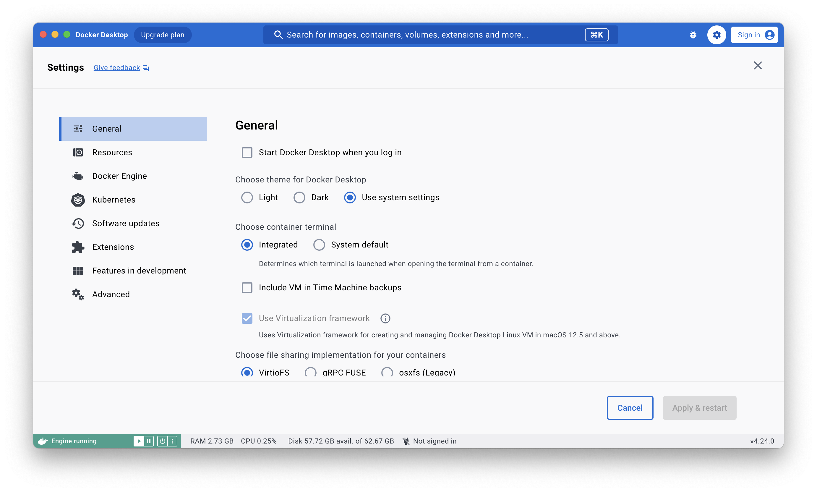 Start Docker Desktop when you log in 을 On 해놓으면 컴 켜질때마다 자동으로 Docker 가 켜진다고 생각하면 된다