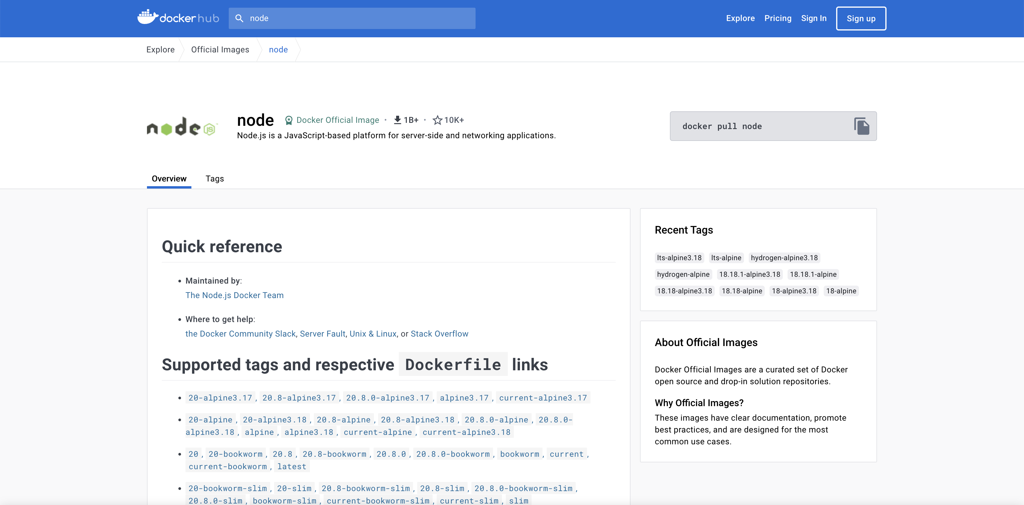 당연하다 없으니까 ... 이후 docker hub 에 있는 node 를 다운받아오게된다