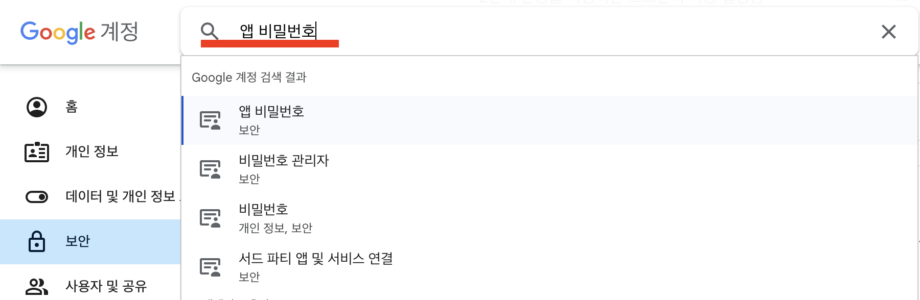 다시 와서 구글 앱 비밀번호 검색 후 만들기