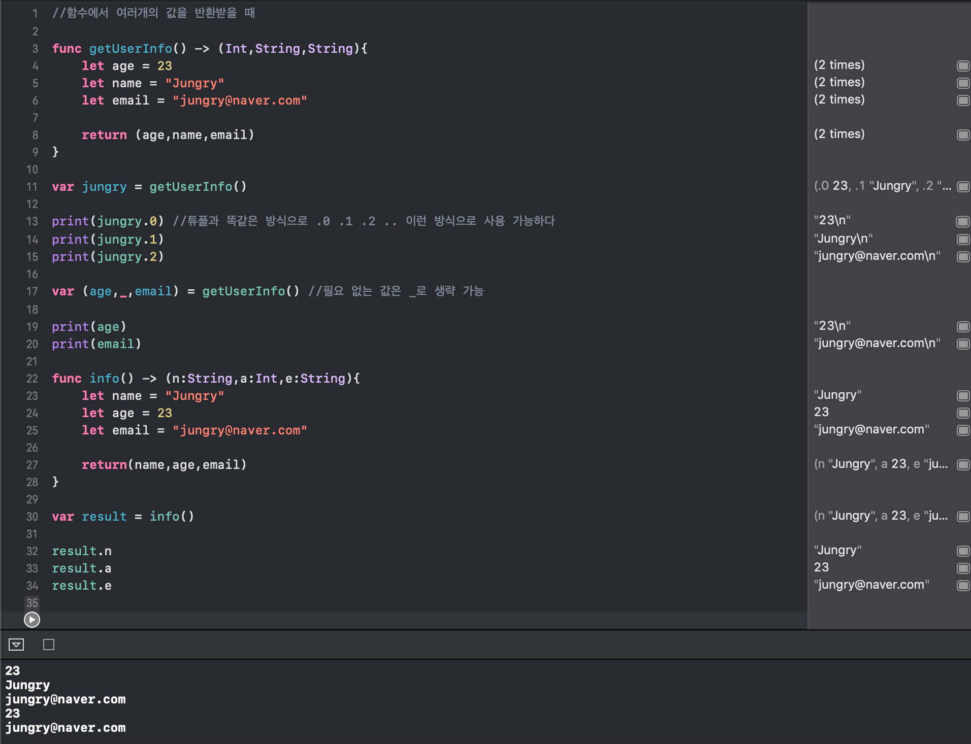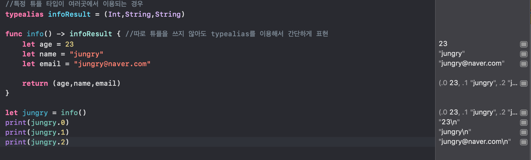 특정 튜플 값이 여러곳에서 이용되는 경우 ! typealias 를 지정해줘서 번거롭게 여러번 사용하지 않아도 된다